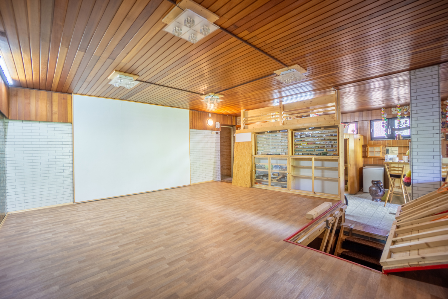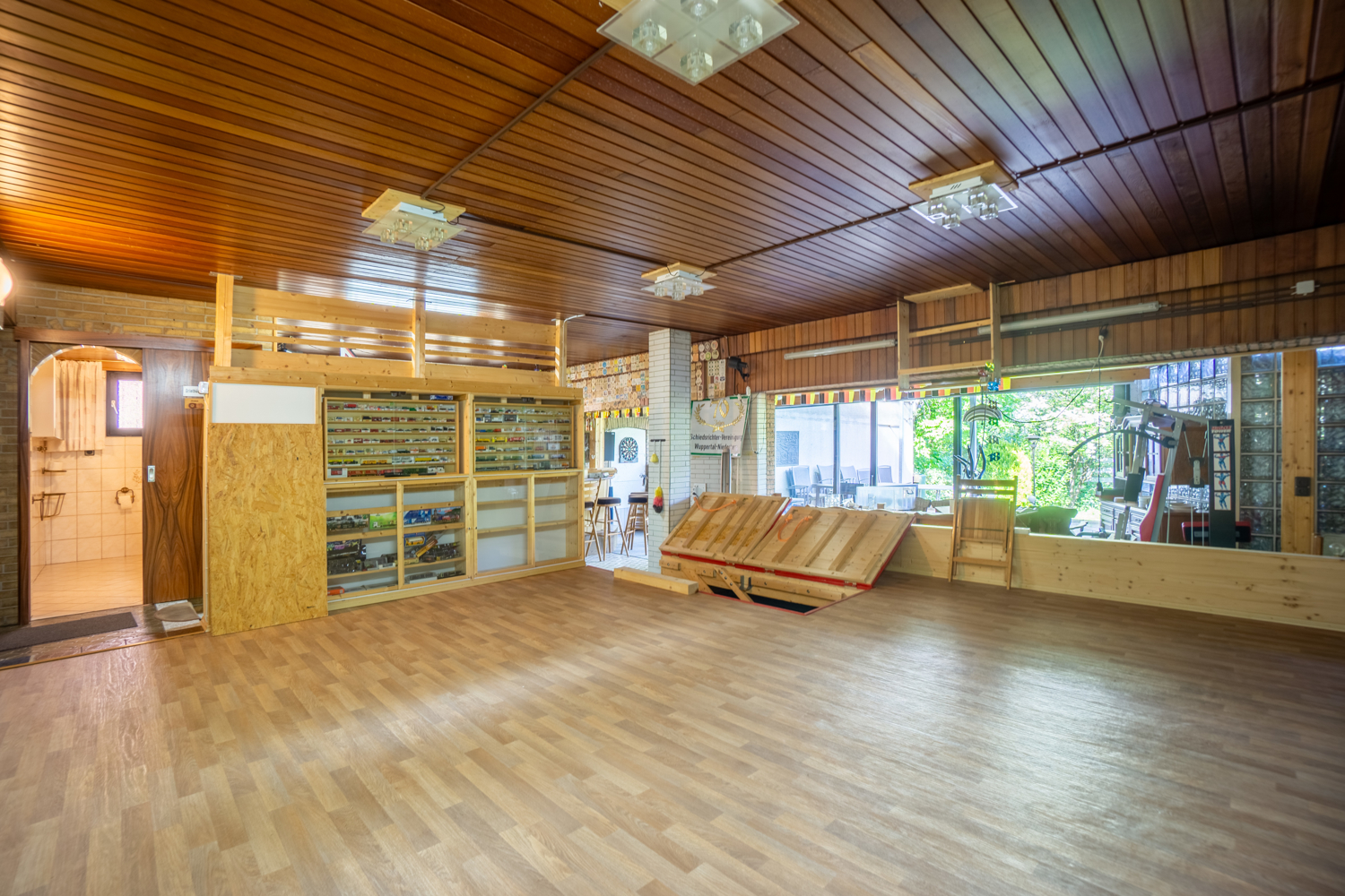 Das Schwimmbad wurde schon vor einiger Zeit stillgelegt und diente dem bisherigen Eigentümer zuletzt auf seiner mehr als 80m² großen Fläche, die heute mit einem Holzboden bedeckt ist, als Besprechungsbereich. Zweckmäßigerweise wird der darunter liegende Pool aktuell als Registratur und zur Aufbewahrung für Büro- und Aktenmaterial verwendet.