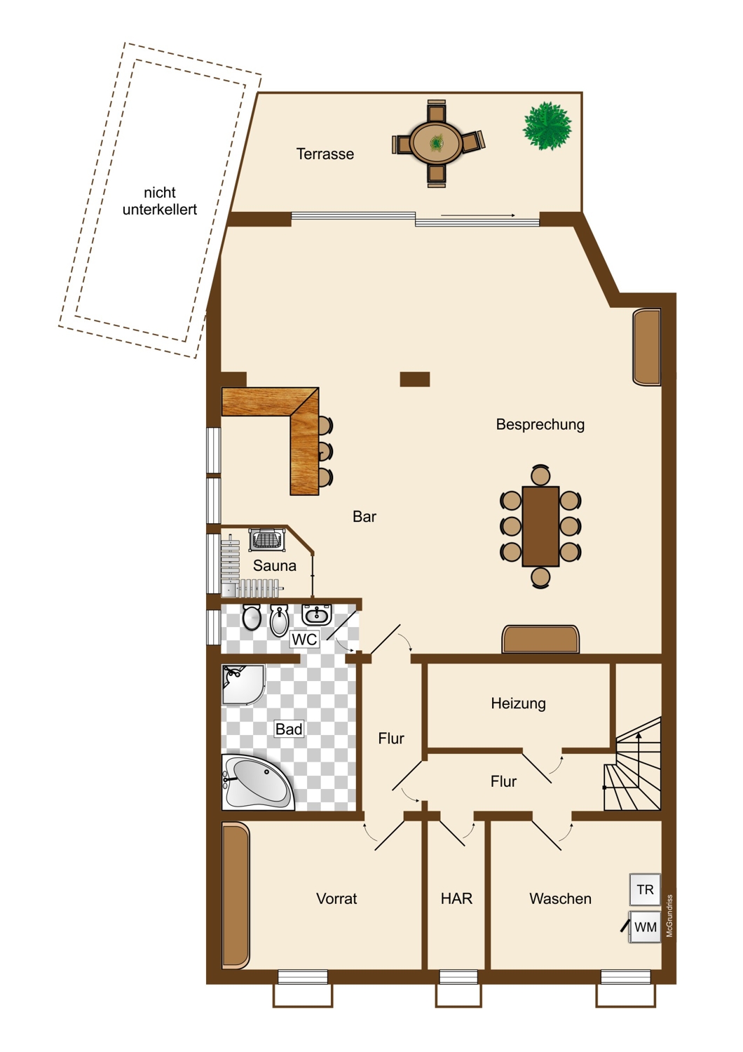 Außerdem führt Sie der Flur in einen großzügigen Barbereich mit Sauna, großem Badezimmer sowie einem ehemaligem Schwimmbad. An die hier beschriebenen Räumlichkeiten schließt sich der ehemalige Fitnessbereich an, der über eine große Schiebetür Zutritt auf die rd. 30m² große Terrasse ermöglicht.