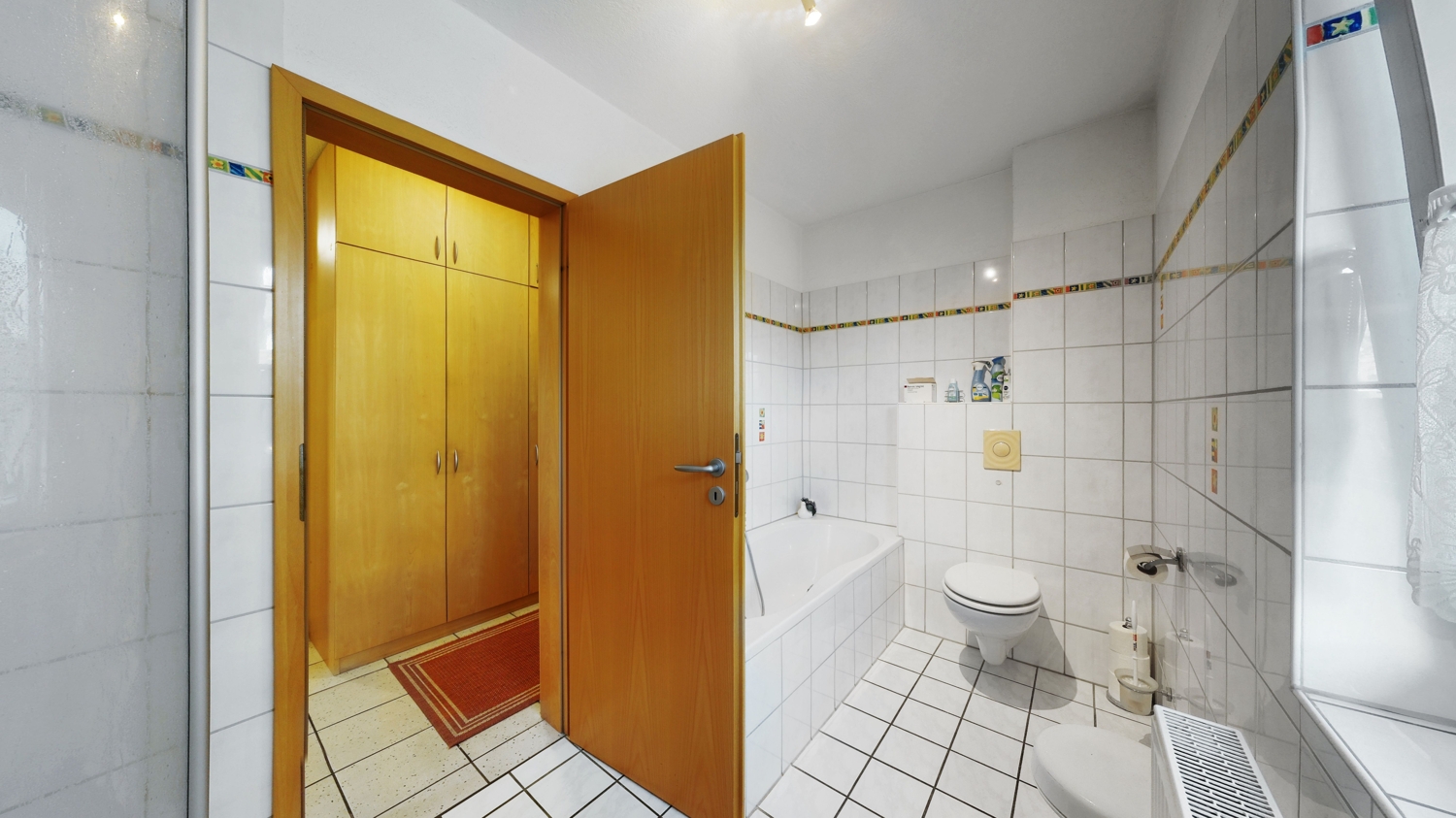 Das Tageslichtbad verfügt über Badewanne und Dusche sowie Waschtisch und WC.