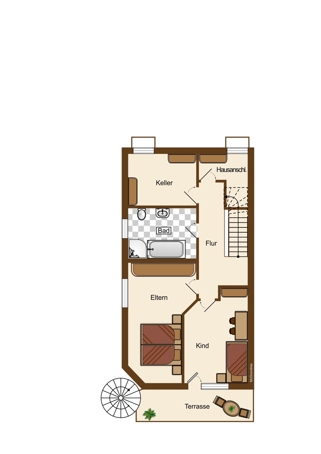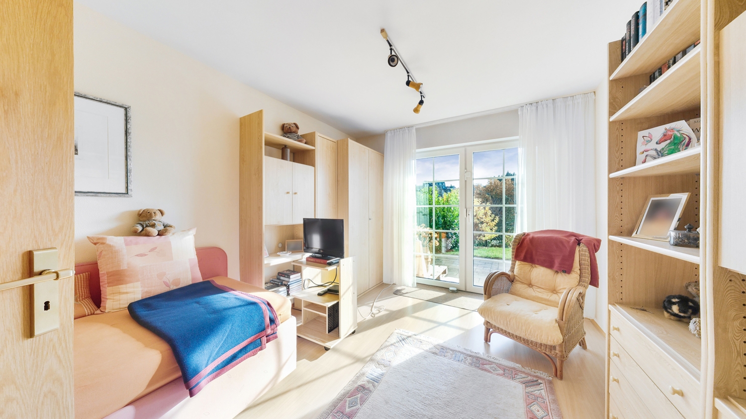 Vom Kinderzimmer aus hat man Zugang auf die Terrasse und in den Garten. In diesem Zusammenhang sei erwähnt, dass die Terrasse mit dem darüber liegenden Balkon über eine Wendeltreppe verbunden ist.