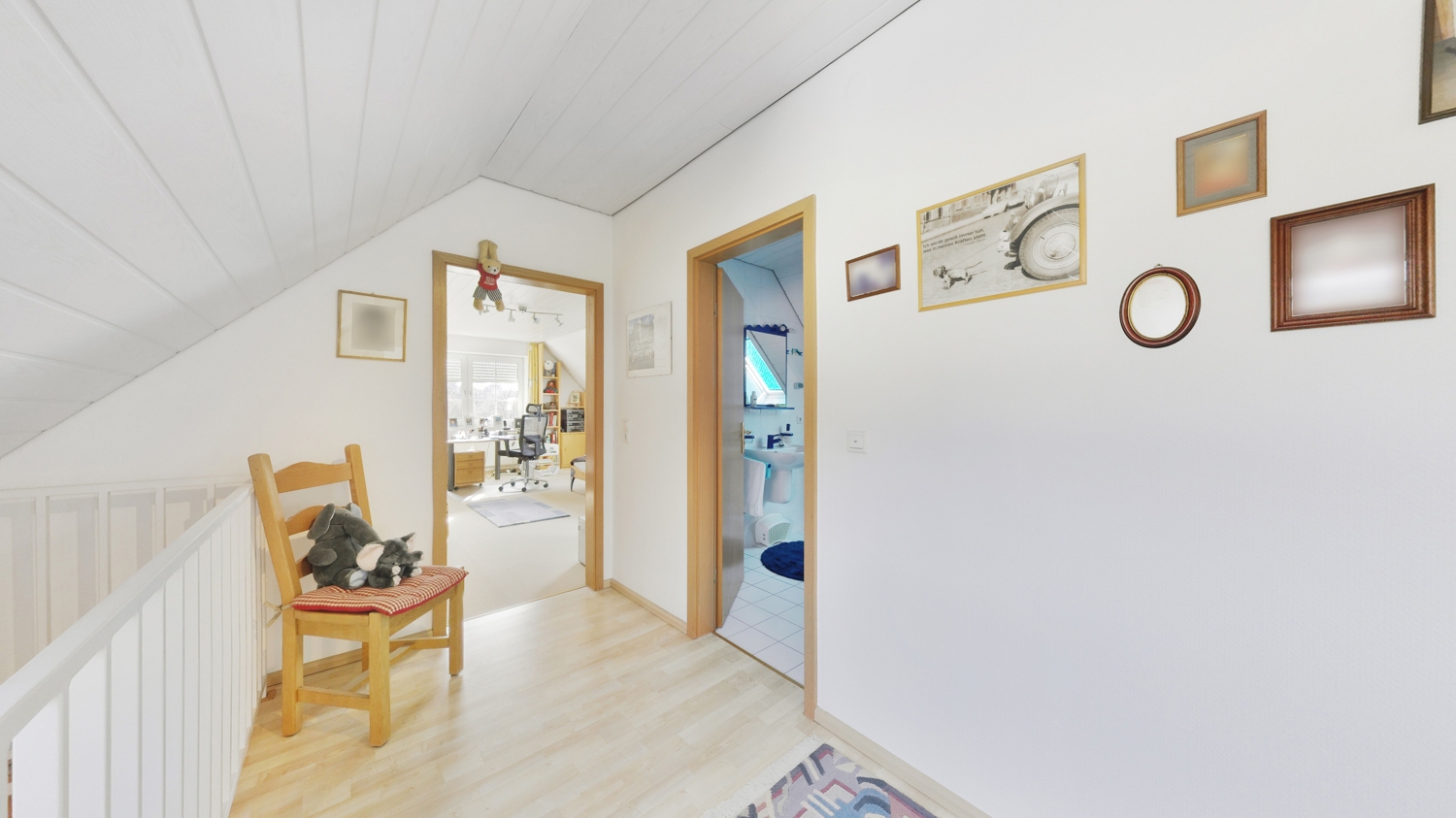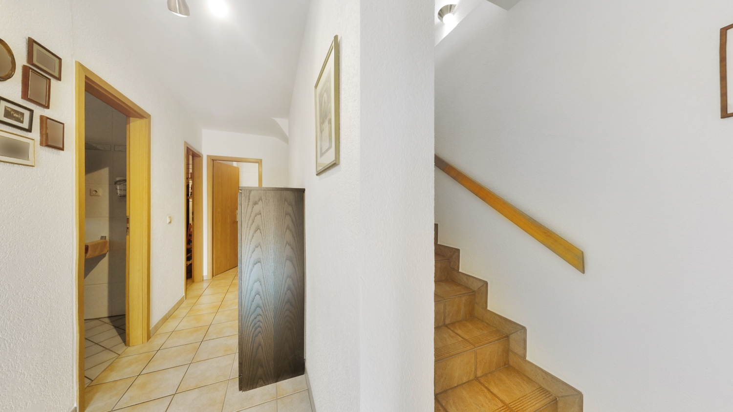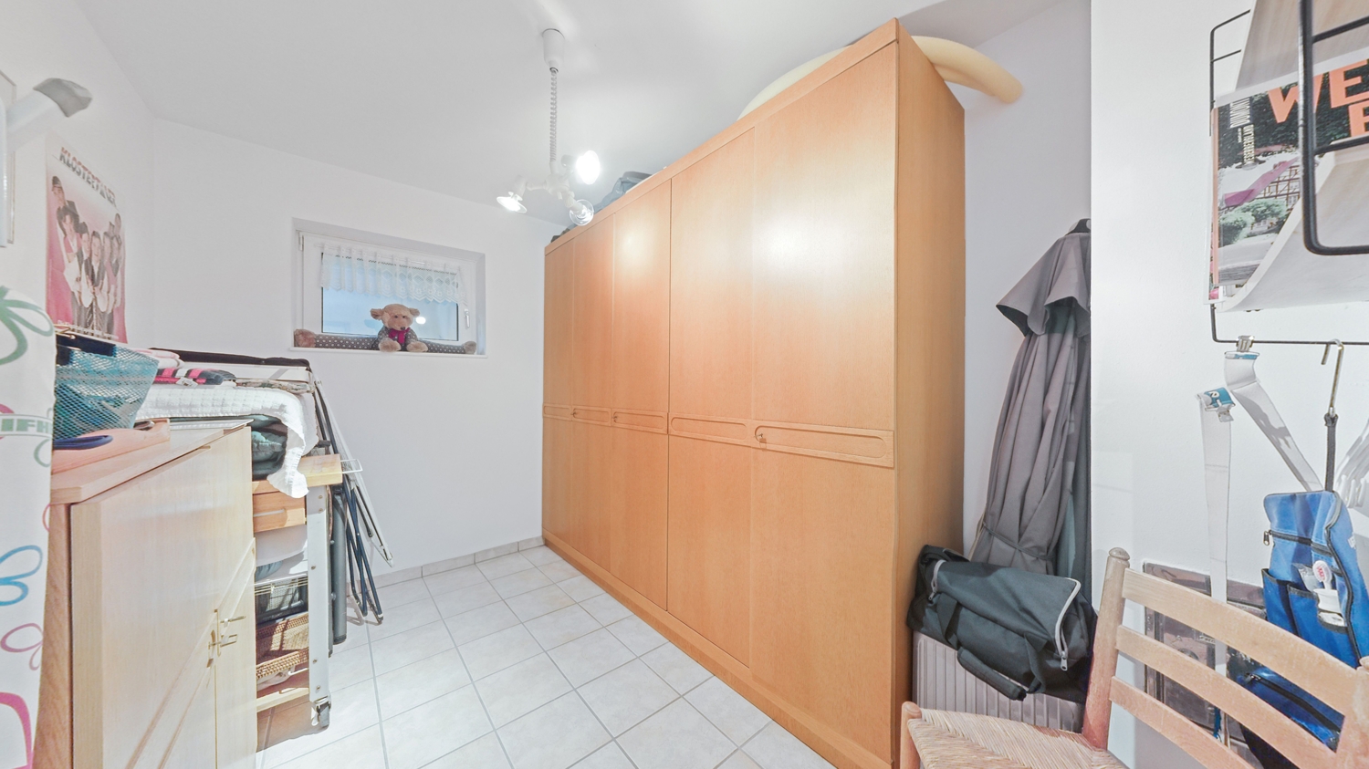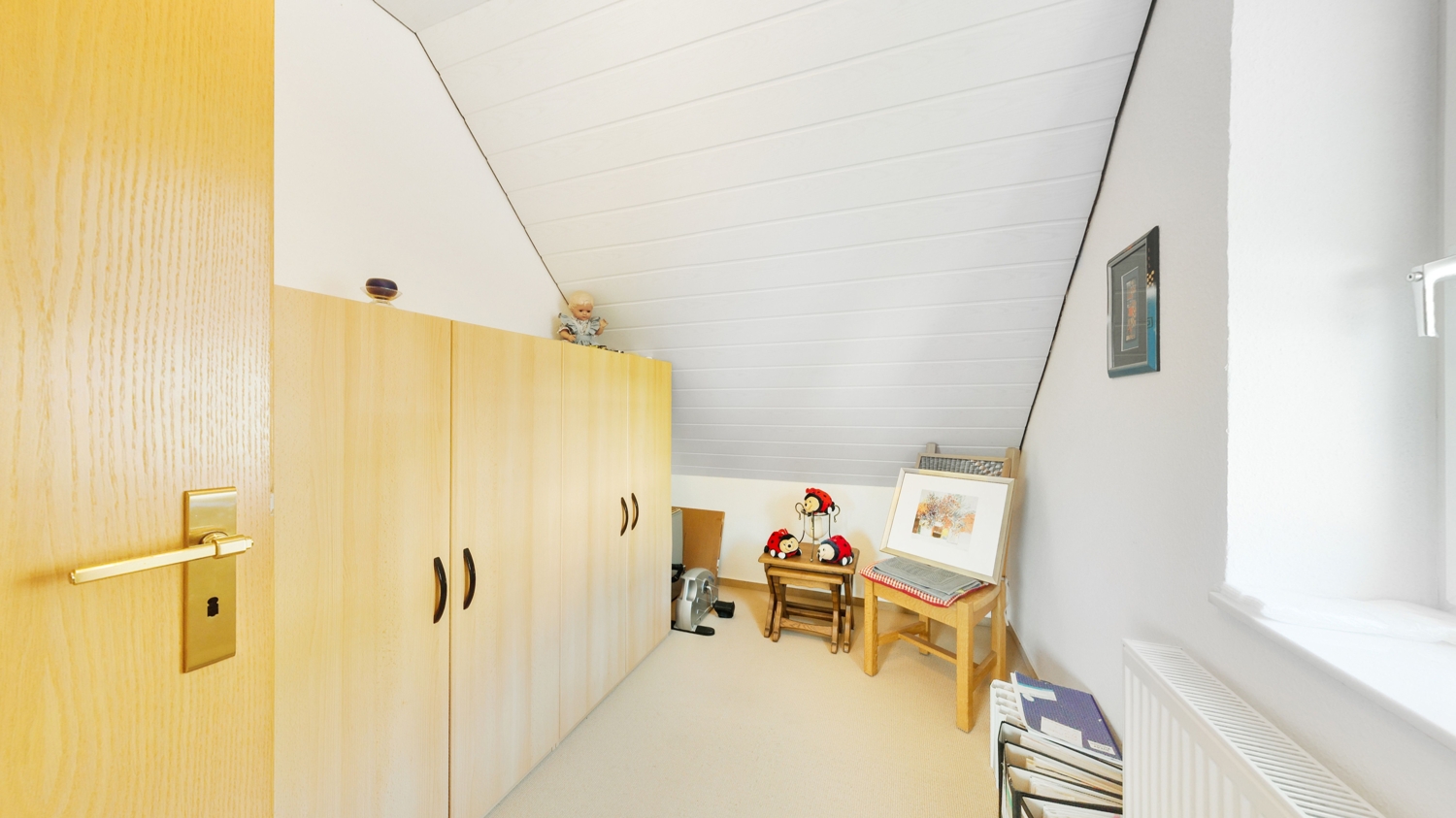 Durch die Hanglage finden sich die Schlafräume auf der unteren Etage. Sie beherbergt neben dem Elternschlafzimmer und dem Kinderzimmer das Tageslichtbad mit Wanne und Dusche sowie einen großen Abstellraum und den Hausanschlussraum, in dem die 2012 installierte Gastherme untergebracht ist.