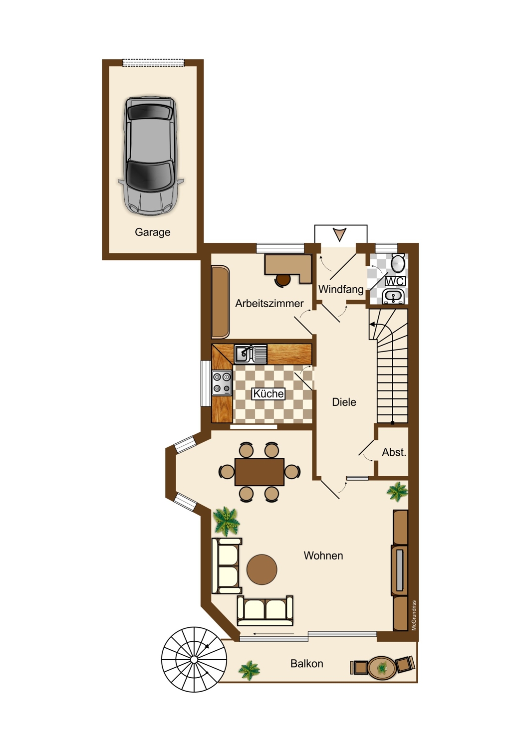 Zum Haus gehört eine Garage, auf deren Vorplatz durchaus noch ein kleiner PKW Platz finden könnte.