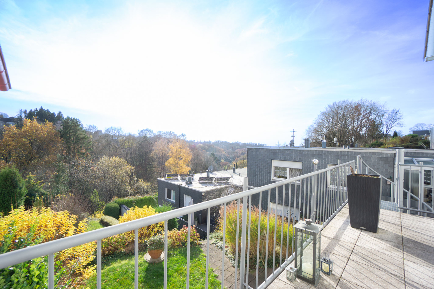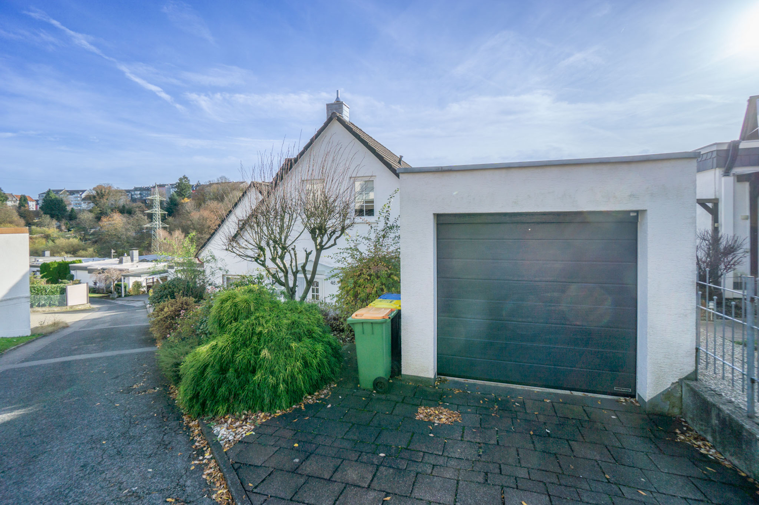 Das 478 m² große Grundstück in Südausrichtung weist eine Hanglage auf. Abgemildert wird diese über einzelne Plateaus die über eine Treppe verbunden sind. Als äußerst praktisch erweist sich in diesem Zusammenhang, dass man mit dem Grünschnitt nicht jedes Mal durch das Haus laufen muss, vielmehr ergibt sich die Möglichkeit, das rückwärtige Grundstück über einen unterhalb verlaufenden Wirtschaftsweg zu erreichen.