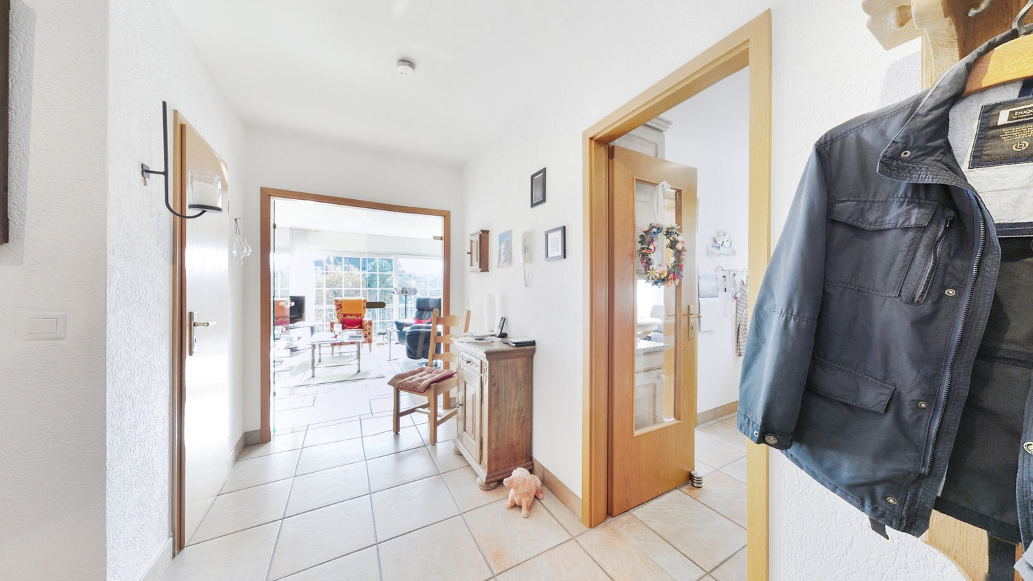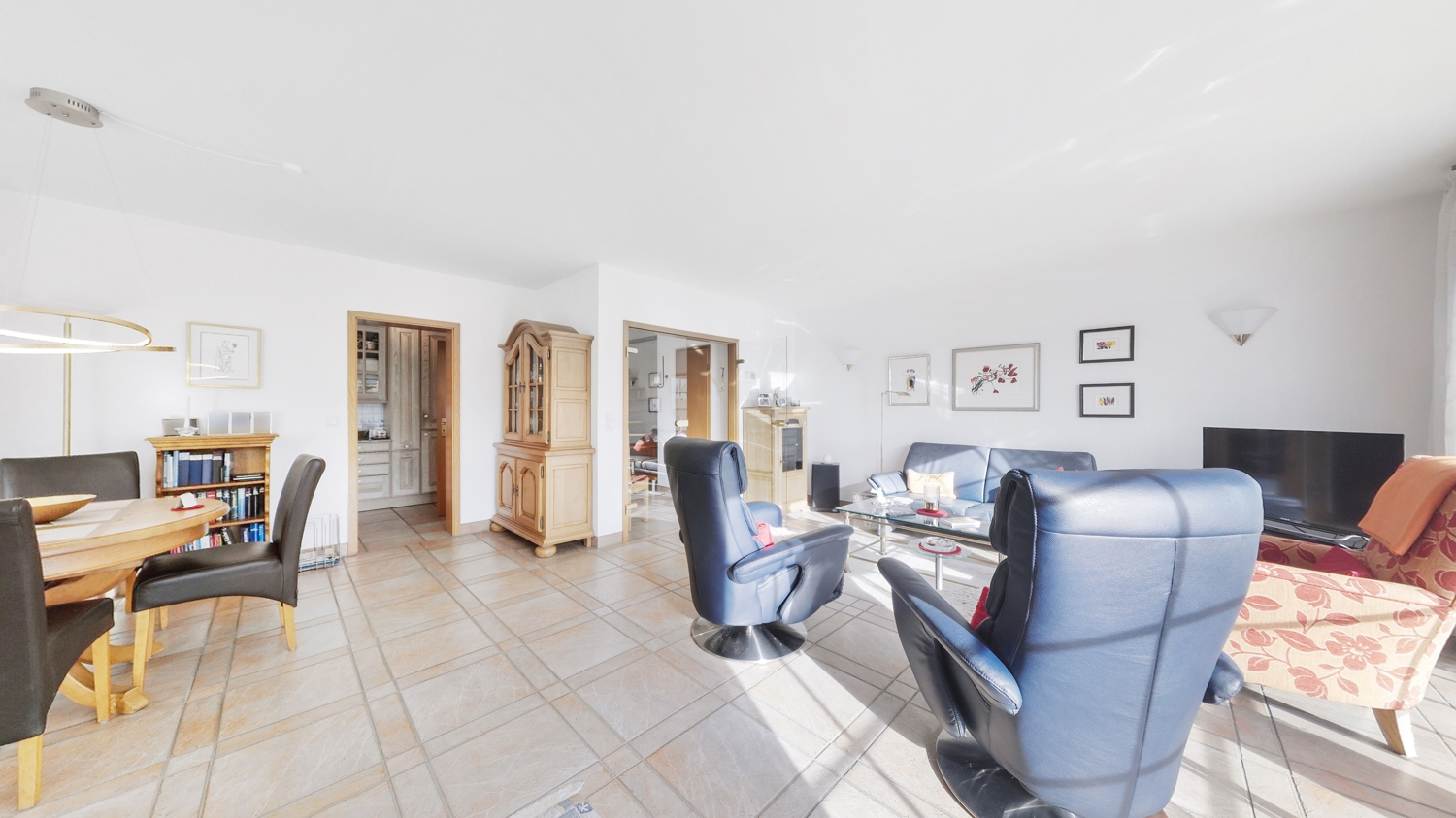 Über einen Windfang von dem das Gäste-WC abgeht, gelangt man in den großen Flur, der zu den übrigen Räumen des Erdgeschosses führt: Büro, Küche, Abstellraum und schließlich das einladende, mehr als 30 m² große Wohnzimmer mit seiner phantastischen Fensterfront. Von hier haben Sie Zugang auf den Balkon. Außerdem genießen Sie, neben ausreichender Helligkeit im ganzen Raum, einen tollen Blick ins Grüne und über die angrenzenden Ortsteile.