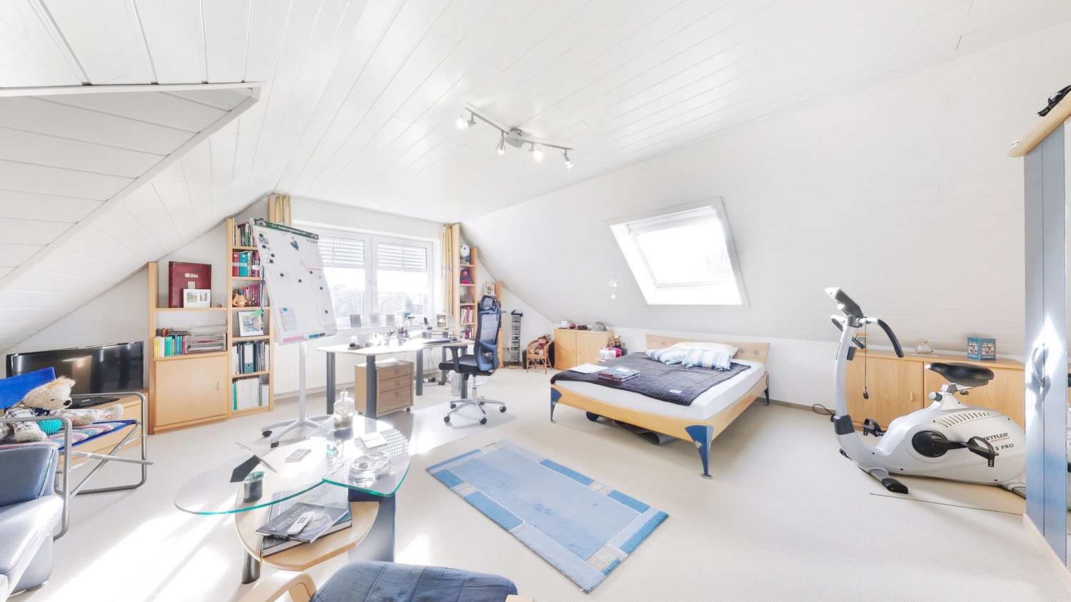 Ursprünglich 2-geschossig geplant, hat die Immobilie noch während der Bauphase ein Satteldach erhalten, was die Wohnfläche von 118 m² auf die aktuellen, knapp 163 m² anwachsen ließ.