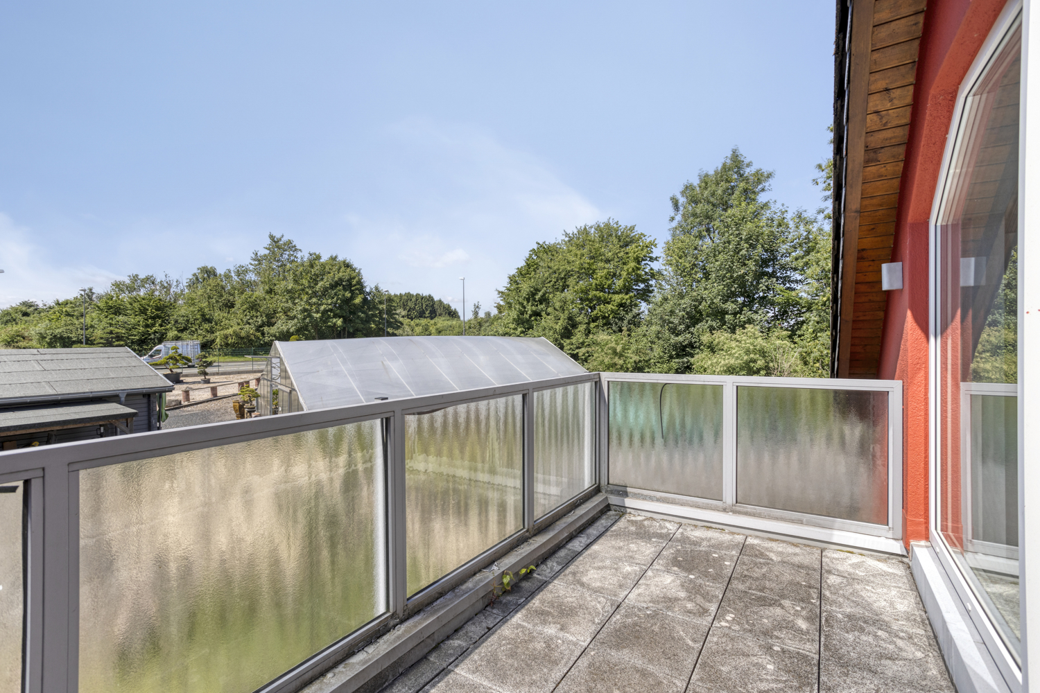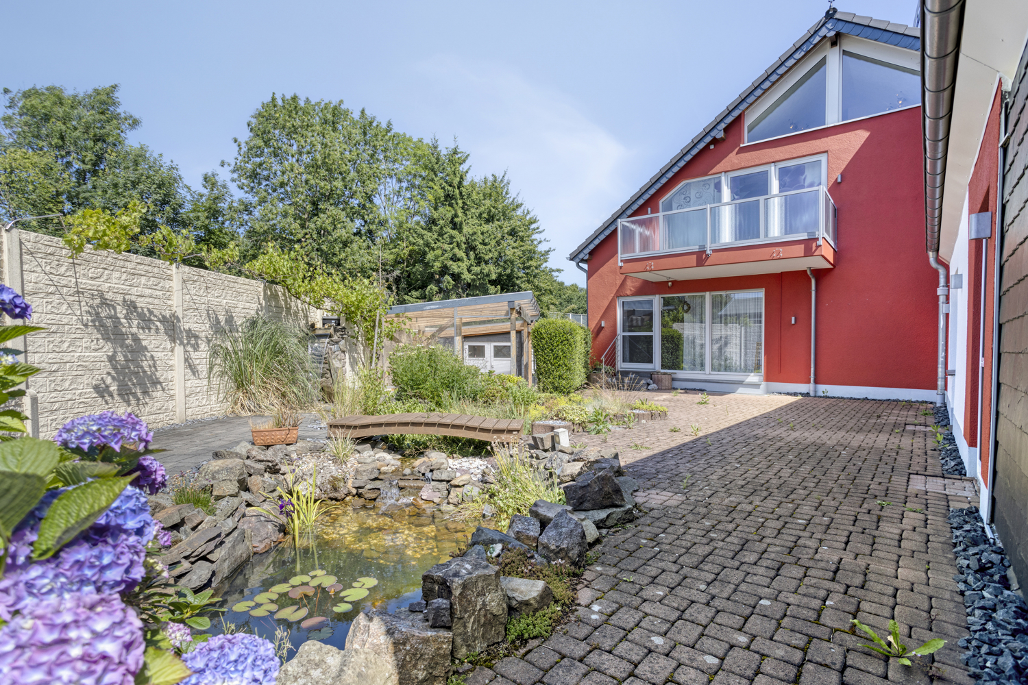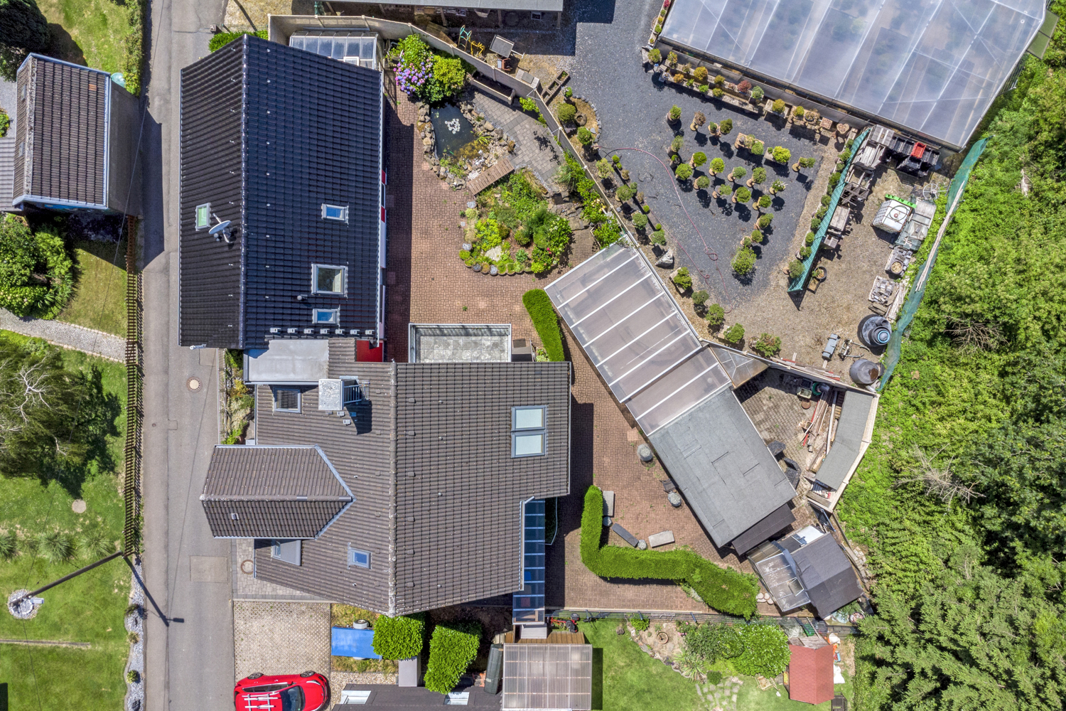 Ebenfalls nicht hierin enthalten ist die großzügige Terrassenanlage. Diese bildet den Ausgangspunkt des hinteren, nach Westen ausgerichteten Grundstücks. Dieses ist aufwändig angelegt und bietet neben 2 Gewächshäusern, einen Teich mit Wasserlauf, einen überdachten Grillplatz, eine Sitzecke mit Feuerstelle, eine Außendusche und ein massives Gartenhaus, in dem die Möglichkeit besteht, eine Küche zu installieren. Abgerundet wird das positive Bild des Außenbereichs durch ein Holzlager, in dem Sie Ihr Kaminholz schlagen und lagern können.