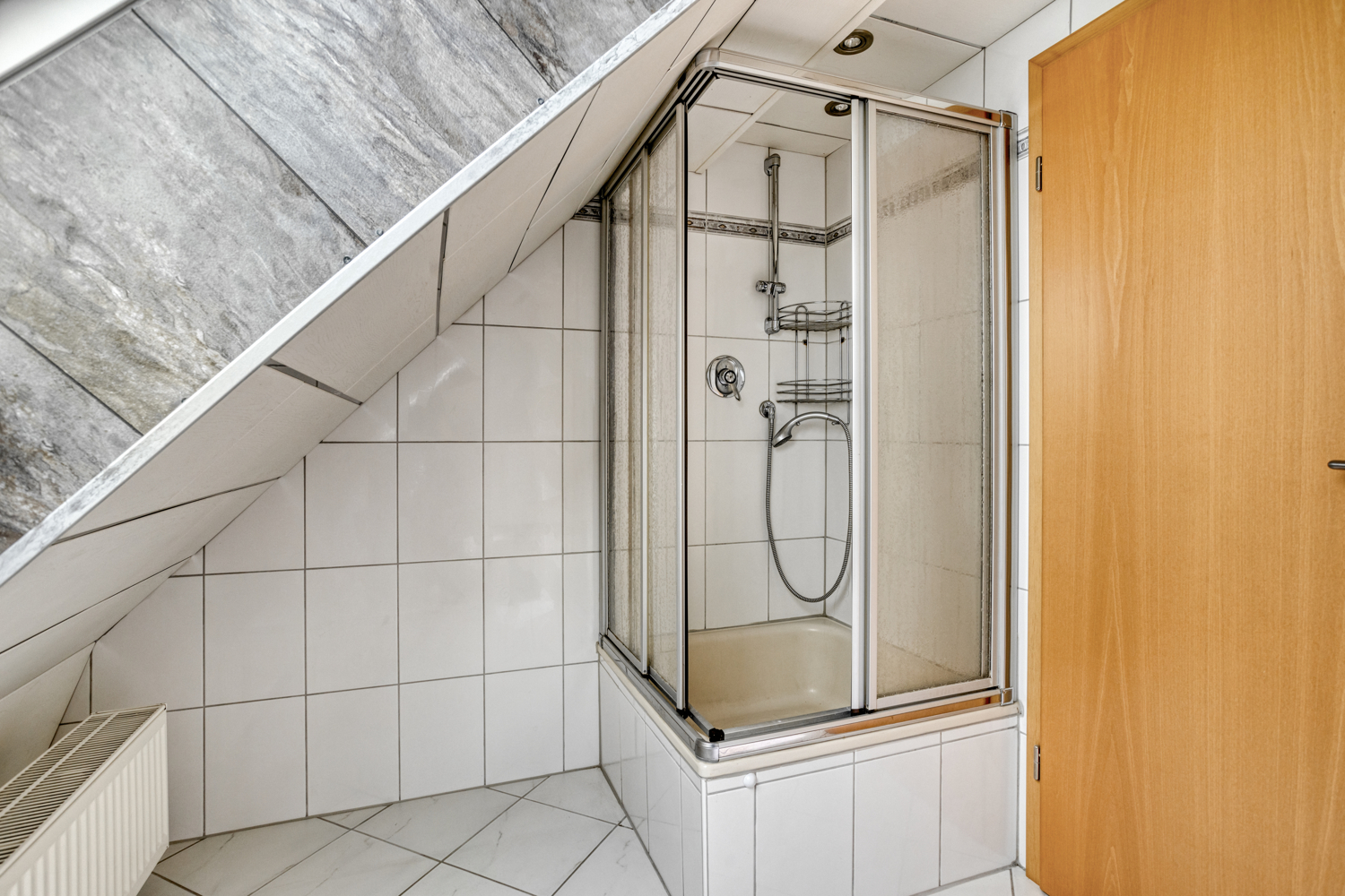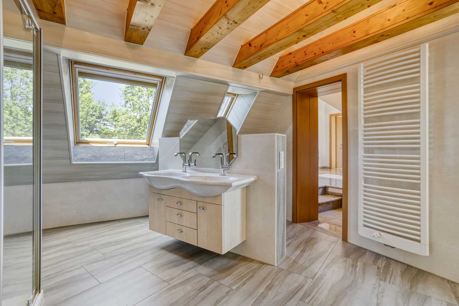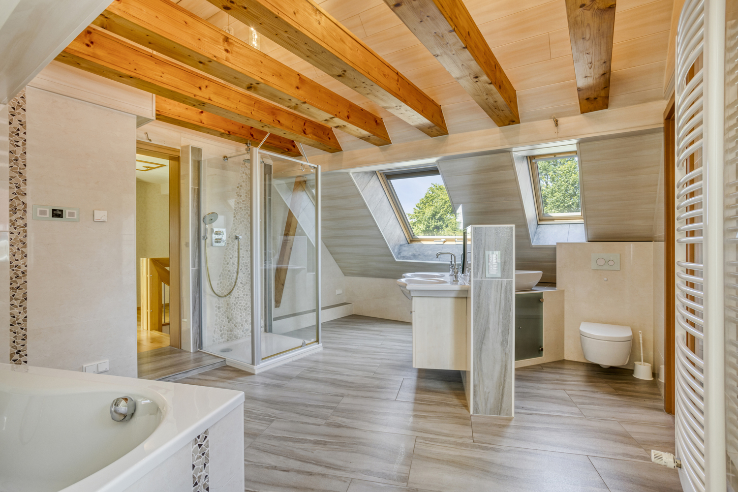 Das Dachgeschoss schließlich wurde vom Eigentümer über die gesamte Fläche von ca. 62m² allein genutzt. Ein Teil des Dachgeschosses des Altbaus ist zwar wohnlich ausgebaut, doch, wegen zu geringer Deckenhöhe, nicht in der hier genannten Wohnfläche enthalten. Hierin enthalten ist auch ein phantastisches Badezimmer, das mit teilfreistehender Wanne, Dusche, 3 Waschtischen, WC in hochwertioger Ausführung keine Wünsche offen lässt.