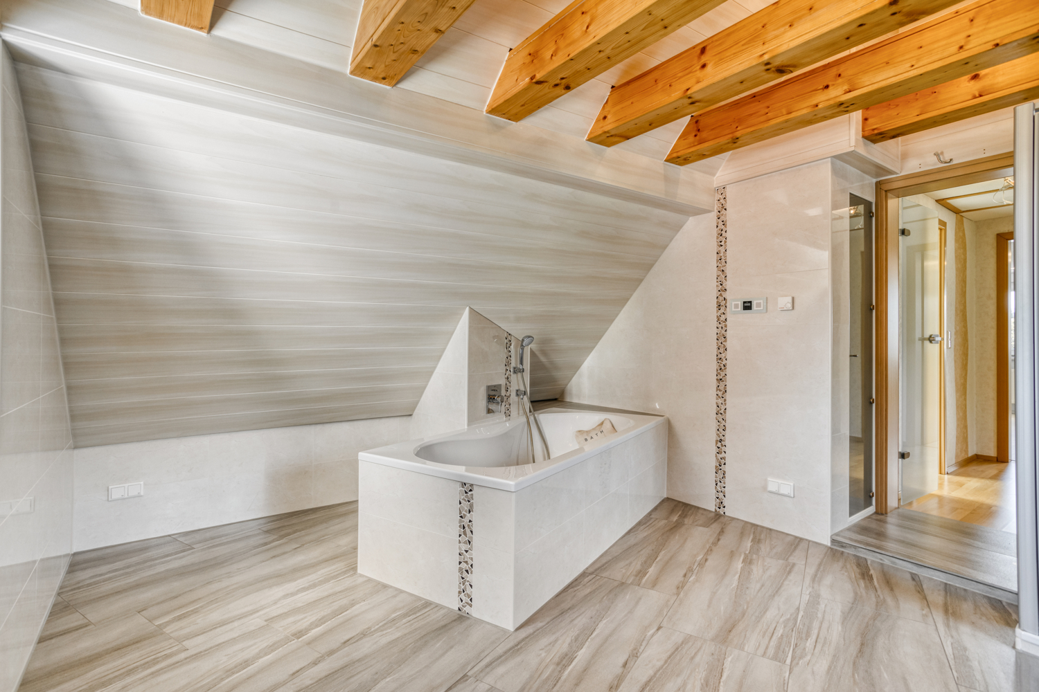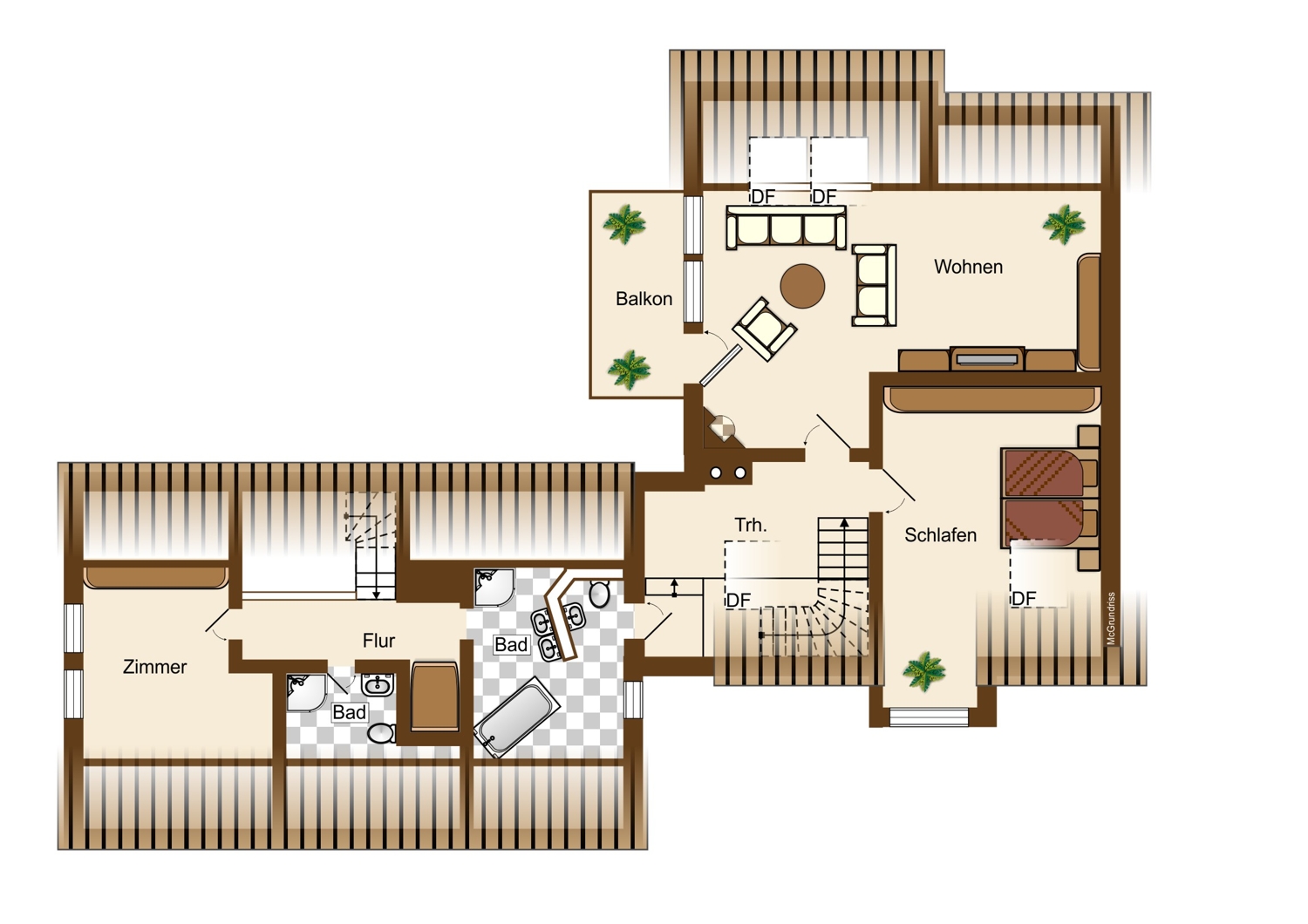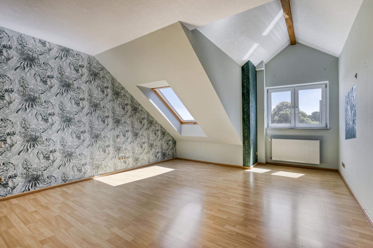 Das Dachgeschoss schließlich wurde vom Eigentümer über die gesamte Fläche von ca. 62m² allein genutzt. Ein Teil des Dachgeschosses des Altbaus ist zwar wohnlich ausgebaut, doch, wegen zu geringer Deckenhöhe, nicht in der hier genannten Wohnfläche enthalten. Hierin enthalten ist auch ein phantastisches Badezimmer, das mit teilfreistehender Wanne, Dusche, 3 Waschtischen, WC in hochwertioger Ausführung keine Wünsche offen lässt.