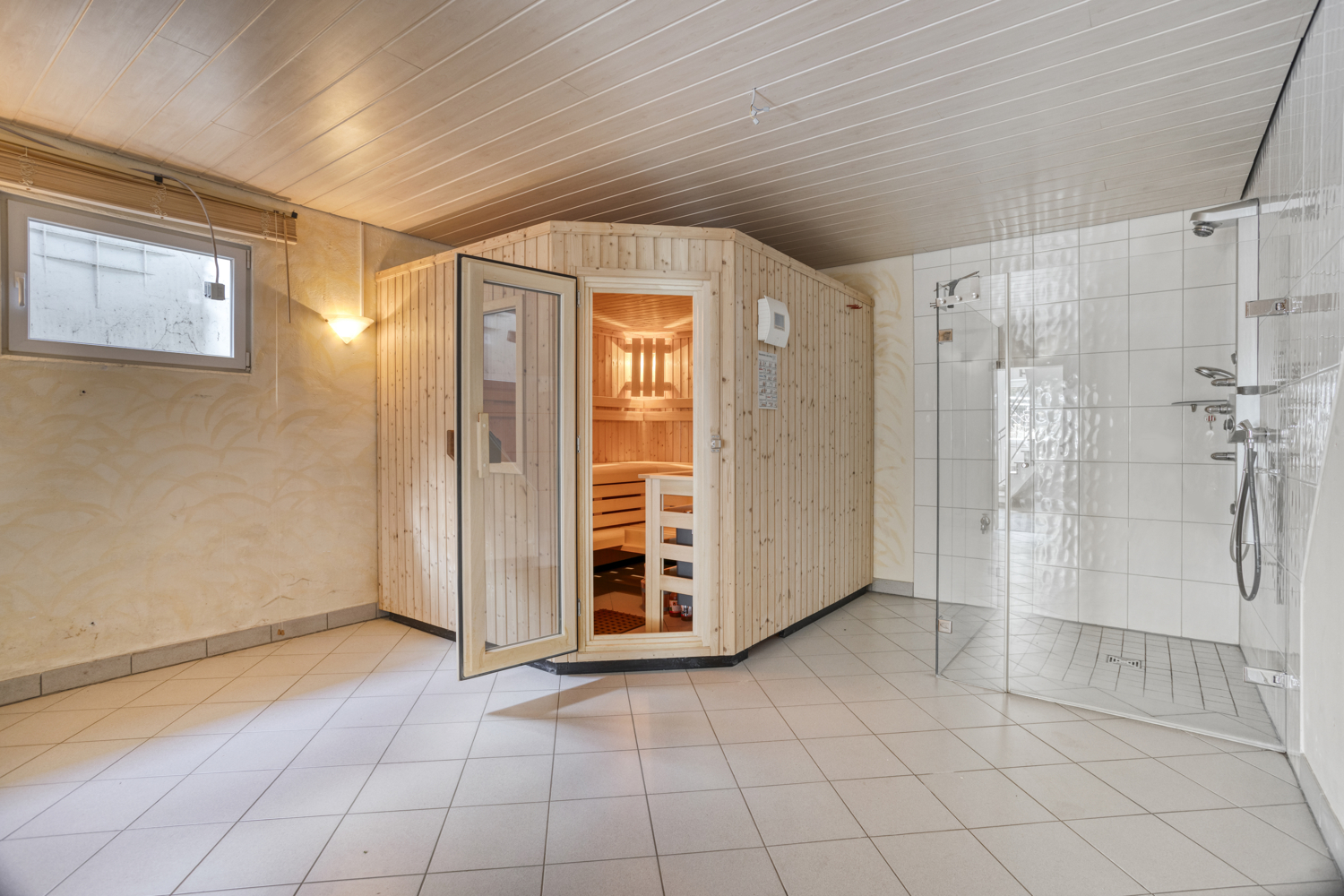 Heizungs- und Anschlussraum (im Altbau), Treppenhaus, Sauna- und Duschbereich, WC, Kellerraum und Garage. Die Garage hat einen direkten Zugang zum Treppenhaus.