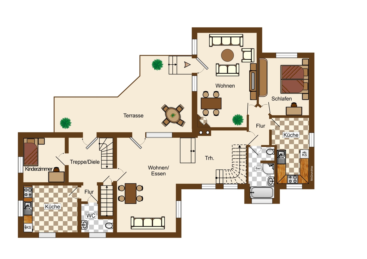Der restliche Teil des Erdgeschosses ist im Altbau untergebracht, der neben einem großzügigen Esszimmer (bisherige Nutzung) von 30 m² Größe über eine Diele, die Küche, WC und Kinderzimmer verfügt. Auch von dieser Seite gibt es 2 Möglichkeiten Zugang zur Terrasse zu erlangen.