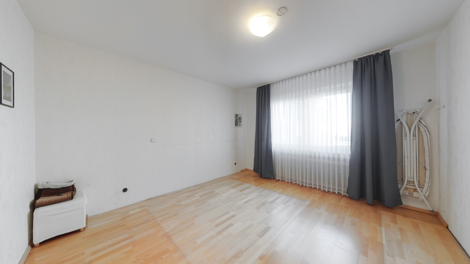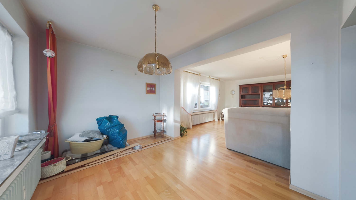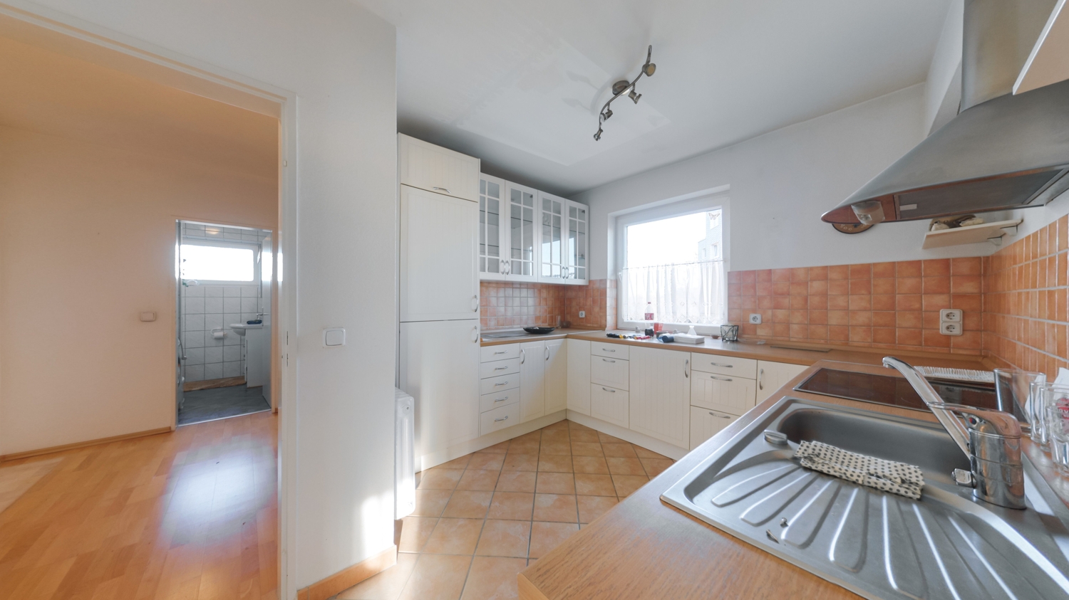 Die Wohnung ist zweckmäßig aufgeteilt. Wohn- und Essbereich mit Austritt auf den Balkon haben eine attraktive Größe von insgesamt rd. 35 m² und sind mit einem Parkettboden ausgestattet. Vom Esszimmer aus hat man Zugang in die Küche, die sich außerdem vom Flur aus erreichen lässt.