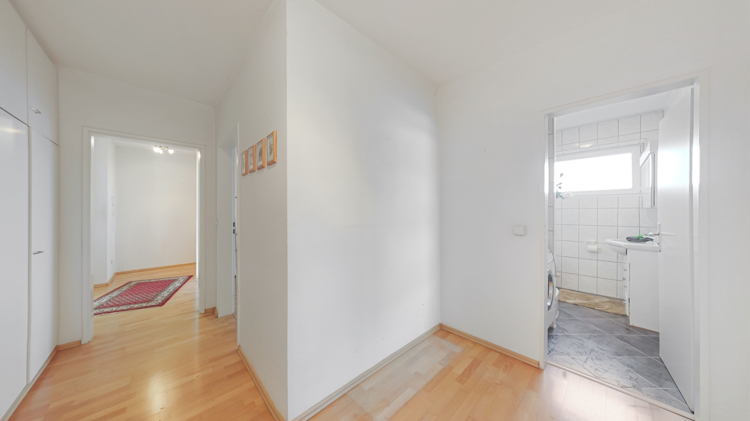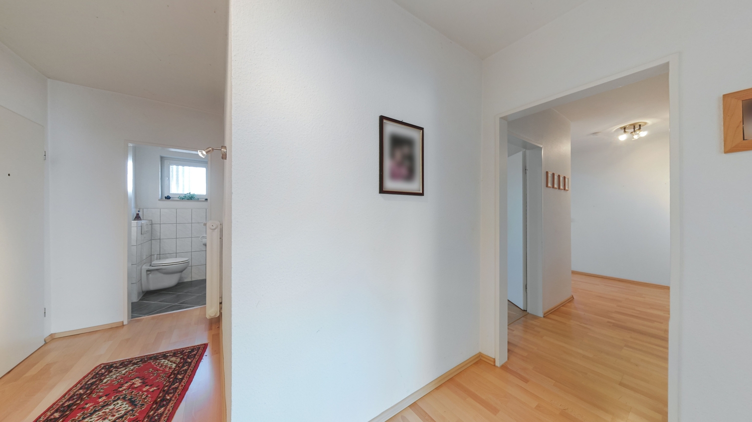 Über Flur und Eingangsdiele gelangt man sowohl zu Schlaf- und Kinderzimmer, als auch zum Duschbad und dem separaten Gäste-WC.